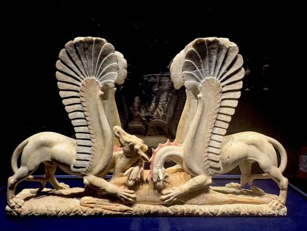 Ascoli Satriano, l’antico “Ausculum” di epoca preromana e abitato dalla popolazione dei Dauni, è una perla preziosa della Puglia dal punto di vista artistico e archeologico. Nel cuore del paese sorge il Polo Museale, che custodisce, tra i reperti di grande pregio artistico e storico, anche i Grifoni realizzati in marmo policromo, unici nel loro genere, il cui valore è inestimabile. Questi pezzi sono stati rinvenuti nel 1976-1978 da alcuni tombaroli che entrarono in una tomba appartenuta ad una famiglia di principi dauna e si ritrovarono nella camera funeraria. Insieme al corredo funerario, venne trovata la coppia di Grifi variopinta. Dopo essere finiti in America, nella collezione del Paul Getty Museum di Los Angeles, questi e altri preziosi oggetti tornarono in Italia, per essere prima esposti a Roma e infine nel Museo di Ascoli Satriano, dove sono tuttora. Sono splendidi capolavori. con molta probabilità al IV secolo a.C, la cui bellezza è rimasta intatta nel tempo, che suscitano grande emozione in chi li osserva.