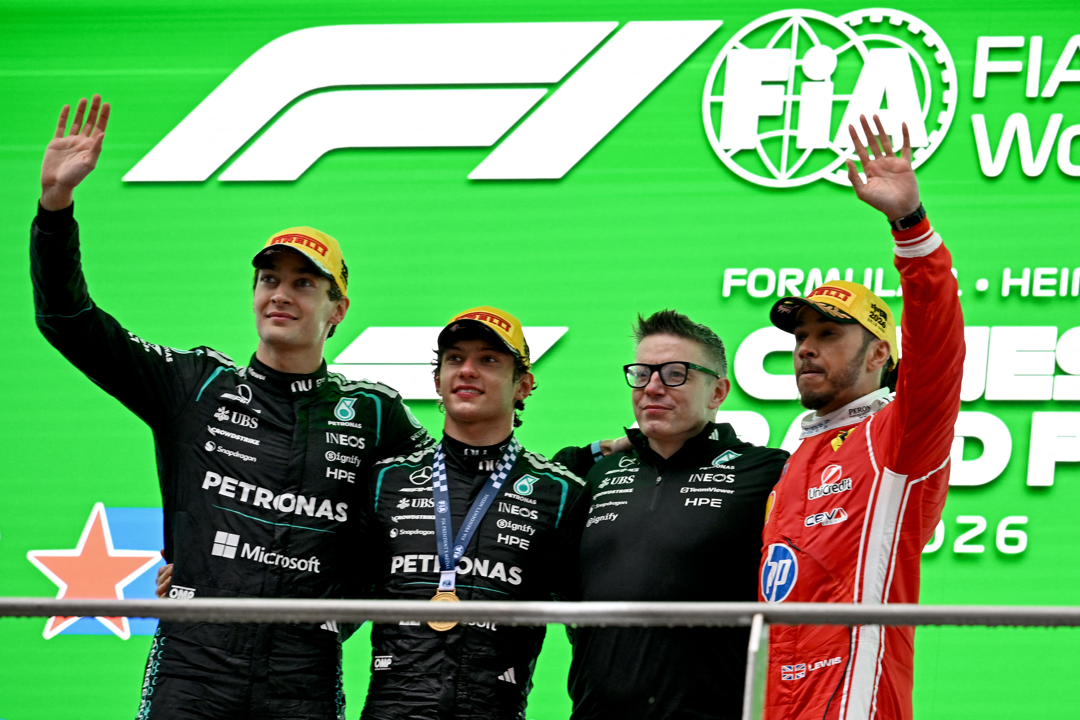 Kimi Antonelli sul podio con George Russell, Lewis Hamilton e il suo ingegnere di pista, Peter Bonnington ex di Hamilton quando era in Mercedes