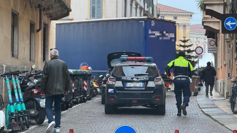 Caos in centro storico: camion incastrato tra via Leoncino e via Tazzoli, strada chiusa