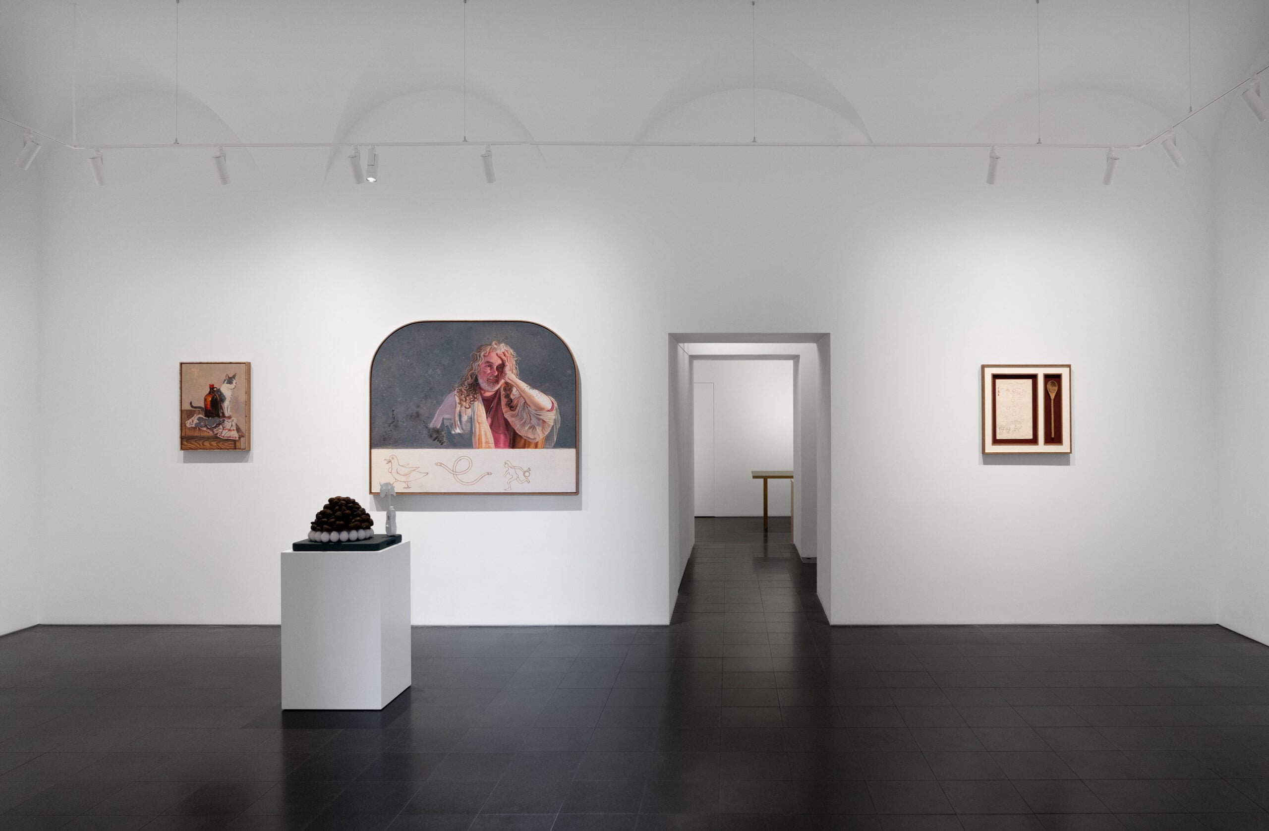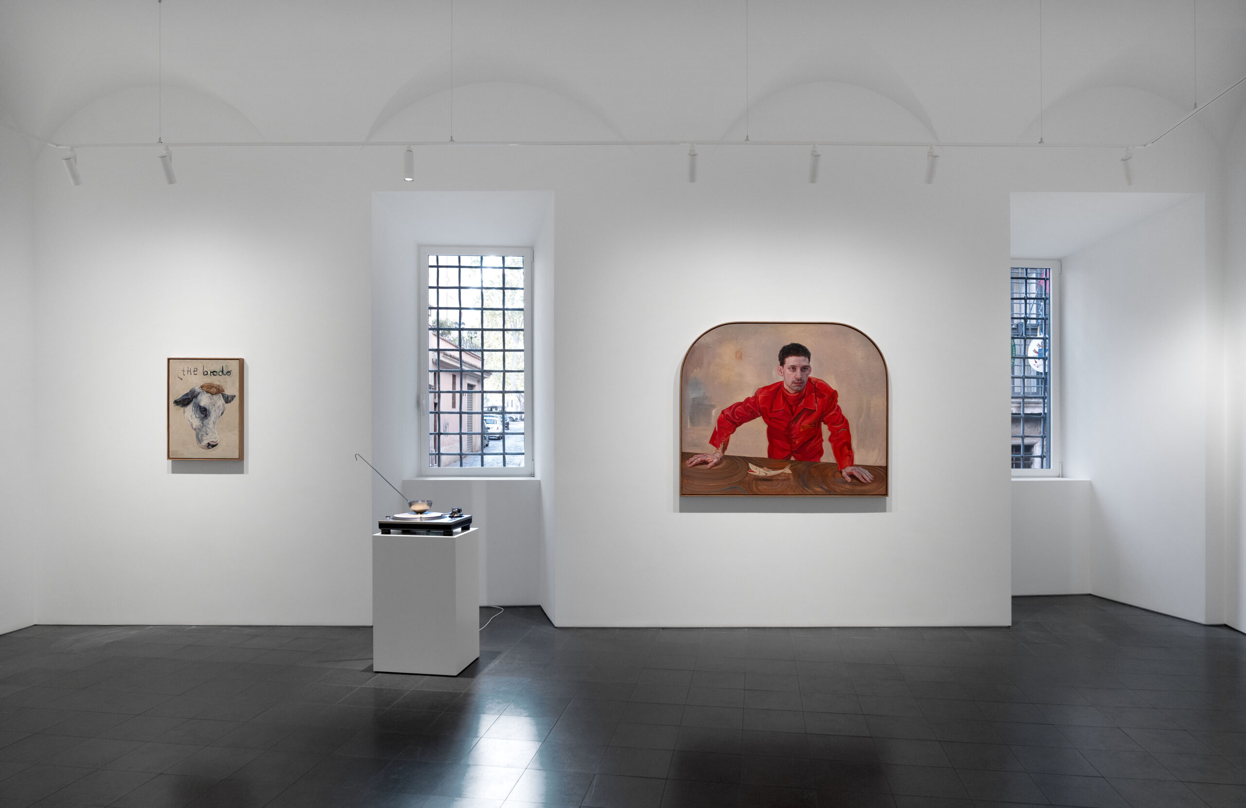 In Zutat I (2025) l’artista è sdraiata su un divano con sua figlia, circondata da animali fiabeschi come in un dipinto surrealista, mentre in Zutat III – Brücke (2025) il protagonista è Thomas, il responsabile della galleria di Roma, con una sgargiante camicia rossa, in atto di alzarsi dietro al piano di un tavolo. In Zutat IV – Mantel (2025) Kati ritrae un vecchio dall’aria stravolta, una sorta di dio pagano che ci guarda con espressione sconsolata, mentre con Zutat II – Taube (2025) l’artista reinterpreta la natura morta seicentesca ambientandola sul tavolaccio di una cucina, dove un gatto sembra avere appena ucciso un uccello. Ancora più provocatorie le tre sculture, tra le quali spicca Bindemittel II (2025), dove sul piatto di un grammofono è appoggiato un mestolo da zuppa. Il brodo di Kati Heck è pronto per essere servito, dopo aver prodotto una mostra divertente, originale e di notevole interesse.