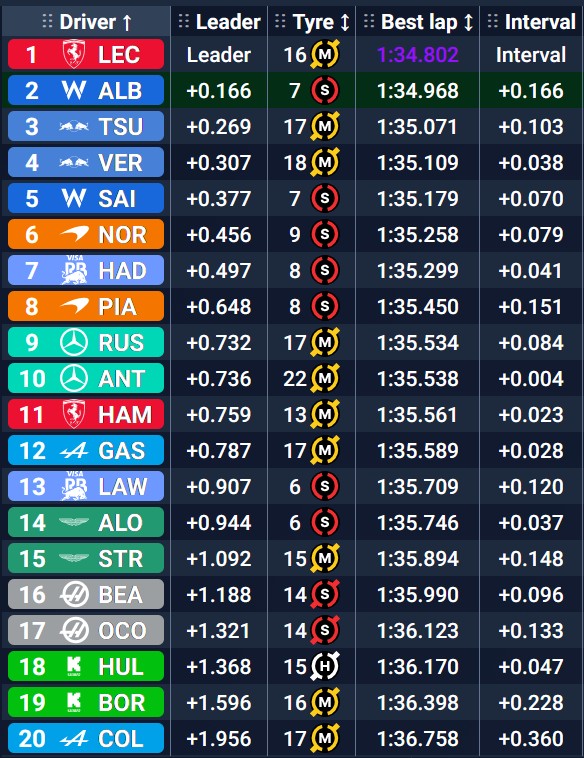 Il primo a far segnare un crono interessante è ancora Charles Leclerc: il monegasco chiude in 1:35.954 l’undicesimo giro sullo stesso treno di gomme medie. A 37 minuti dal termine delle Prove Libere 1, le due Ferrari rientrano ai box per apportare delle modifiche alla messa a punto della SF-25. In pista, invece, si impone Max Verstappen: l’olandese batte il #16 e gira in 1:35.776.