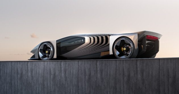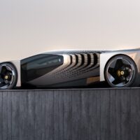Le superfici laterali presentano tagli verticali che richiamano il linguaggio tecnico della recente F80, mentre la livrea tridimensionale con branchie laterali accentua l’identità Ferrari. La struttura posteriore, con due profili verticali e una grande ala superiore, introduce un nuovo codice visivo destinato a influenzare i futuri modelli del marchio.