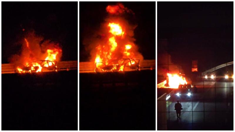 Fuoco e fumo in carreggiata: paura nella notte sulla A4 per un'auto in fiamme / VIDEO