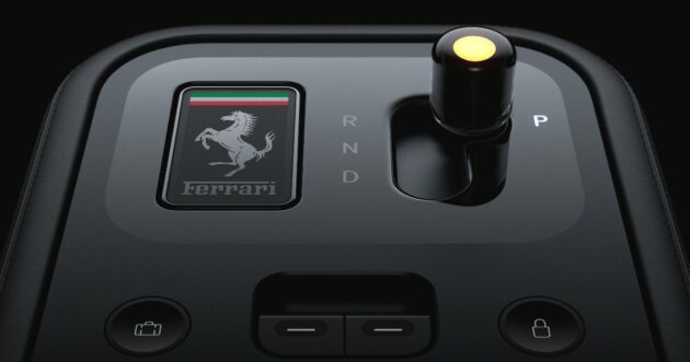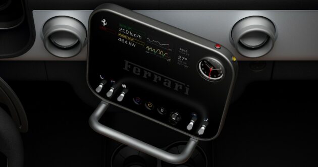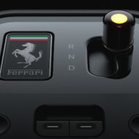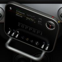 Il pannello di controllo dell’infotelematica è montato su un giunto sferico che consente di orientare lo schermo verso il guidatore o il passeggero. Infine, è da segnalare il selettore del cambio, sempre realizzato in vetro Corning Fusion5: al fine di ottenere il livello di precisione tipico di ogni Ferrari sono stati utilizzati laser per praticare nel vetro migliaia di minuscoli fori, larghi la metà di un capello umano, in modo da depositarvi l’inchiostro per la grafica con un livello di uniformità perfetto.