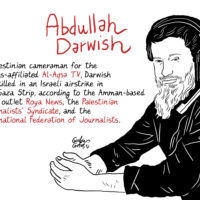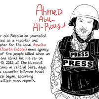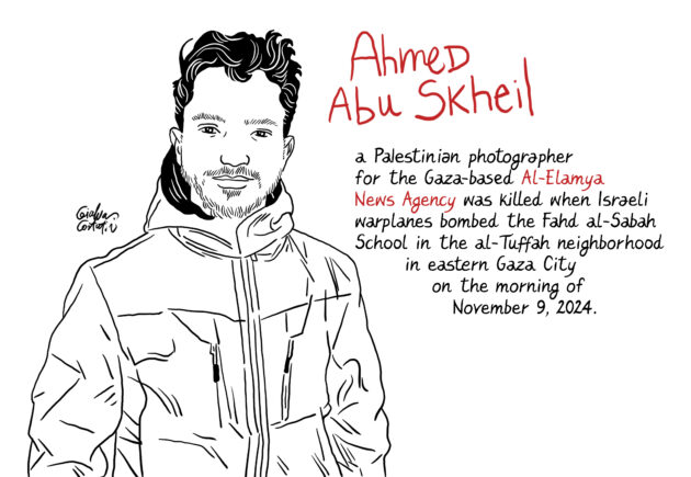 Il lavoro di Costantini, però, va oltre la metafora visiva. In collaborazione con il Committee to Protect Journalists (Cpj), che difende la libertà di stampa e i diritti dei giornalisti in tutto il mondo, l’illustratore ha intrapreso un progetto imponente: restituire un volto a ogni reporter ucciso durante il conflitto. In un’epoca segnata da fake news e intelligenza artificiale, il suo segno a china si trasforma in una prova di esistenza. Ogni disegno restituisce un nome, una biografia, una presenza concreta. Spesso la fase di documentazione è stata dolorosa: “In molti casi non si trovava nemmeno una fotografia – racconta Costantini – Era stata sterminata la famiglia, distrutta la casa, cancellata la redazione. Senza l’aiuto di altri colleghi palestinesi (alcuni dei quali sono poi finiti essi stessi in questa galleria di morti), non avremmo potuto restituire loro la dignità dell’immagine”. Questo archivio visivo intende strappare i testimoni all’anonimato dei numeri, evitando che chi ha raccontato la guerra venga ucciso due volte: dalle bombe e dall’oblio.