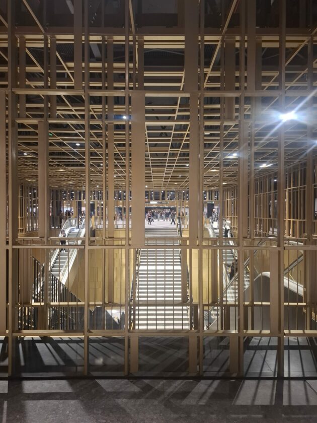 Cinque ambiti tematici scandiscono quindi il percorso dall’atrio alle banchine, accompagnando il visitatore in una discesa nel tempo e nello spazio: il racconto delle trasformazioni dell’area dei Fori Imperiali, i pozzi come strumenti di vita quotidiana in epoca arcaica, il paesaggio antico della Velia, i pozzi rituali. Il grande vano scale centrale, a rampe incrociate, è concepito come il “Foro della stazione”: uno spazio pubblico interno che organizza flussi e sguardi. Le discenderie verso le banchine dei binari è scandita da campane luminose che dilatano lo spazio verso l’alto, evocando pozzi virtuali. Sulle banchine, incisioni astratte dialogano con il paesaggio archeologico della superficie senza sovrapporsi. Il dispositivo museografico, organizzato su una dualità drammaturgica tra pieno e vuoto, oscurità e luminosità, diventa struttura portante del senso. La luce artificiale è usata per privilegiare la penombra, trasformando gli ambienti tipici della metropolitana in un’inattesa occasione di archeologia pubblica.