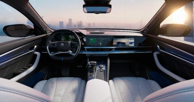 All’interno l’impostazione è da lounge, con un forte accento su digitalizzazione e atmosfera. La plancia è dominata da tre schermi da 12,3 pollici riuniti nell’OpenR Panorama Screen, più un head-up display in realtà aumentata da 25,6 pollici. Renault lavora anche su qualità e comfort acustico – dettaglio fondamentale nel segmento alto – e su un ambiente “premium” che passa da illuminazione, materiali e insonorizzazione.