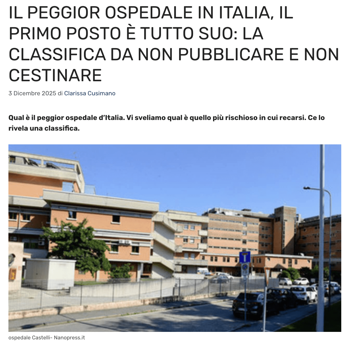 Rettifica dell’articolo recante il titolo “IL PEGGIOR OSPEDALE D’ITALIA, IL PRIMO POSTO E’ TUTTO SUO”