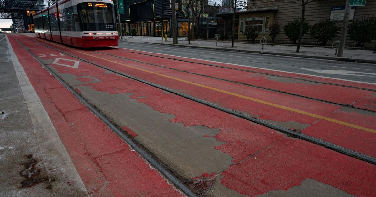 Paint on newly installed priority streetcar lanes peeling weeks after being painted