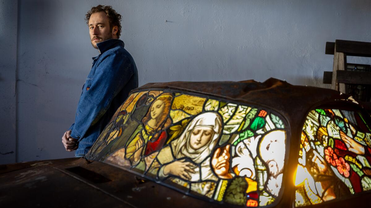 Artist Ben Tuna has turned the shells of burned-out vintage Porsches into artistic symbols of revival through his work with stained glass salvaged from churches.