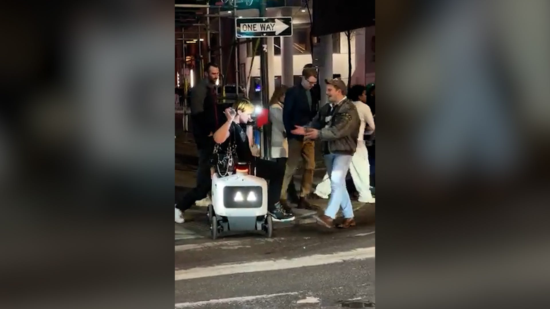 A delivery robot used for Uber Eats appears unfazed after being sat on and graffitied in footage filmed on a Philadelphia street.