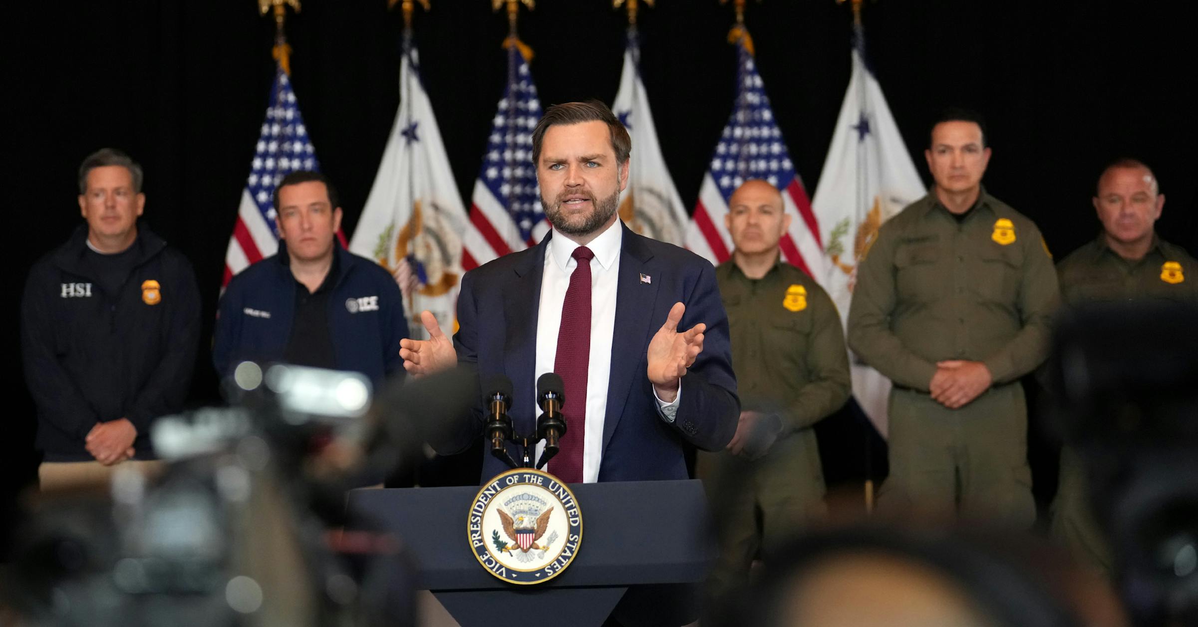 The vice president met privately with ICE agents and business leaders before telling reporters he hoped to “take down the temperature a little bit.”
