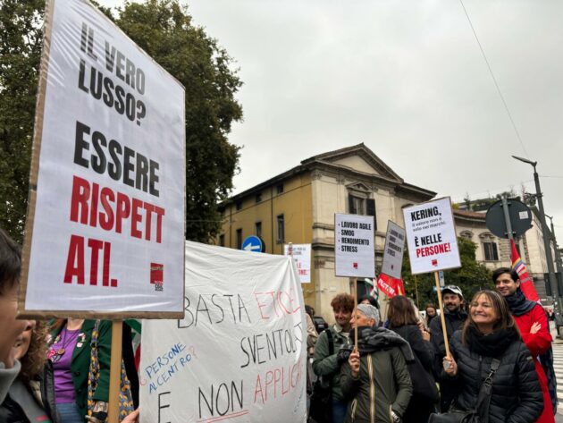 Un fronte compatto che non si vedeva da un quarto di secolo. Stamattina, i dipendenti di tutti i marchi del Gruppo Kering in Italia – da Gucci a Bottega Veneta, da Yves Saint Laurent a Balenciaga – hanno scioperato per le prime quattro ore, con presidi a Milano e Scandicci. È il primo grande scontro sociale dell’era di Luca De Meo, il top manager chiamato a risanare i conti del gruppo, ed è reso ancora più significativo da fatto che ad incrociare le braccia sono tanti ‘colletti bianchi’, evento assai raro nel mondo della moda. A Scandicci, cuore della pelletteria di lusso, sono scesi in piazza non solo gli operai, ma soprattutto gli impiegati della progettazione, sviluppo e industrializzazione. Una mobilitazione storica, condivisa “a larga maggioranza” e sostenuta “con circa il 90% dei voti favorevoli in assemblea“, che segna la fine di un’era di relazioni industriali pacifiche e l’inizio di uno scontro frontale con la nuova dirigenza del gruppo. Siamo in attesa dei dati sull’adesione, ma parliamo di 1.200 dipendenti da Gucci, 250 da Balenciaga (con logistica e parte produzione), 30 in Alexander McQueen e 200 in Ginori 1735.