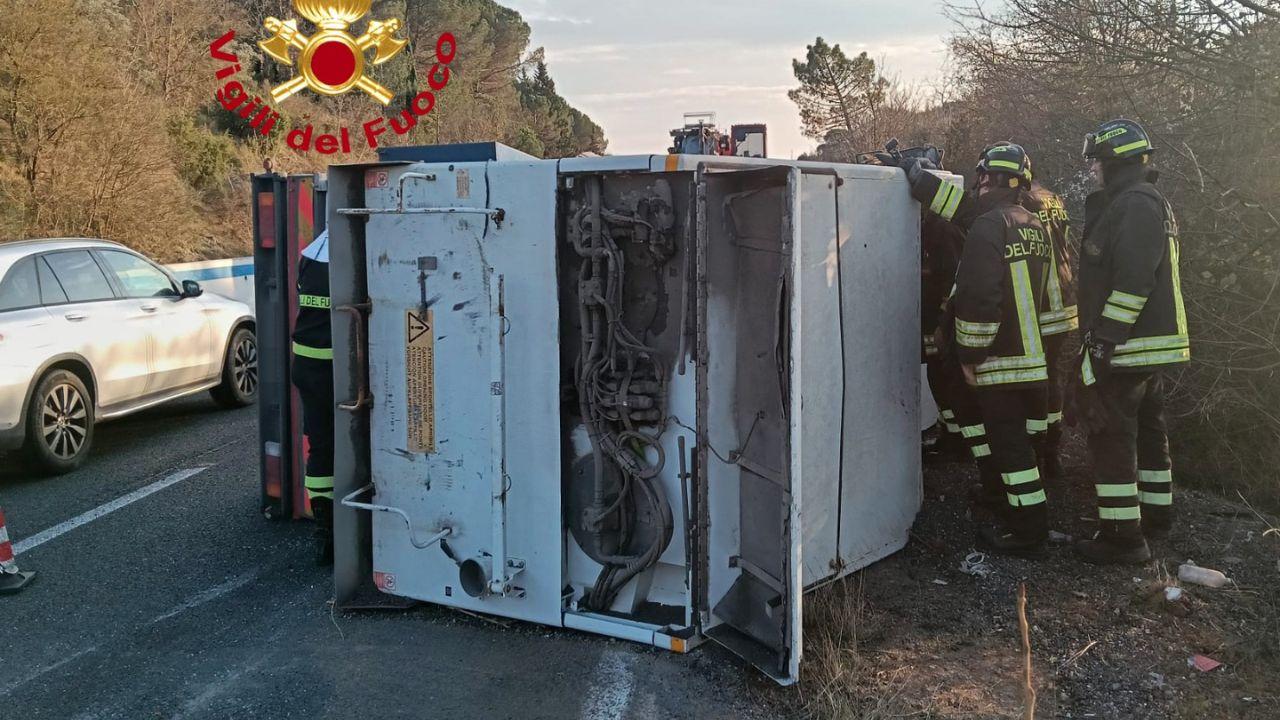Ferito il conducente che è rimasto intrappolato nel mezzo: sul posto, oltre al personale sanitario del 118, i vigili del fuoco