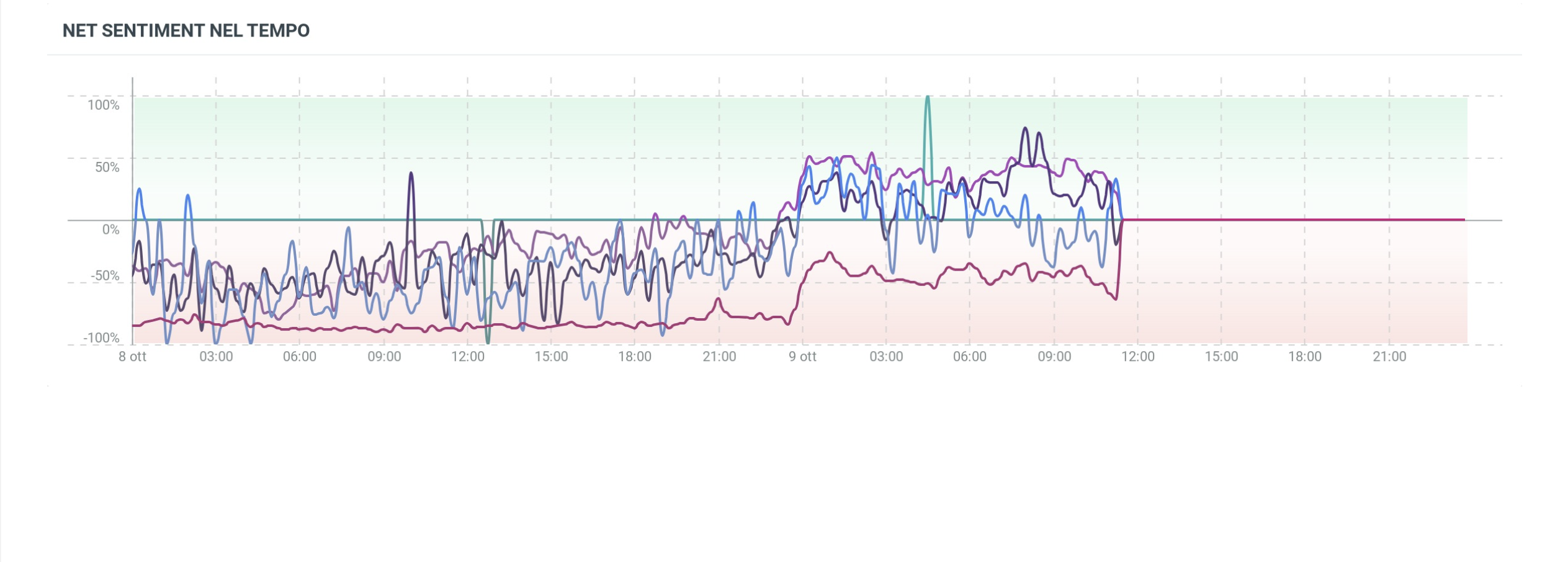 La linea temporale del sentiment registrato dalla parola chiave Gaza – censita in inglese, arabo, persiano e turco – fa segnare in tutte le conversazioni sin dalle prime ore del 9 ottobre una crescita evidente, che passa da una prospettiva negativa a una dimensione positiva.