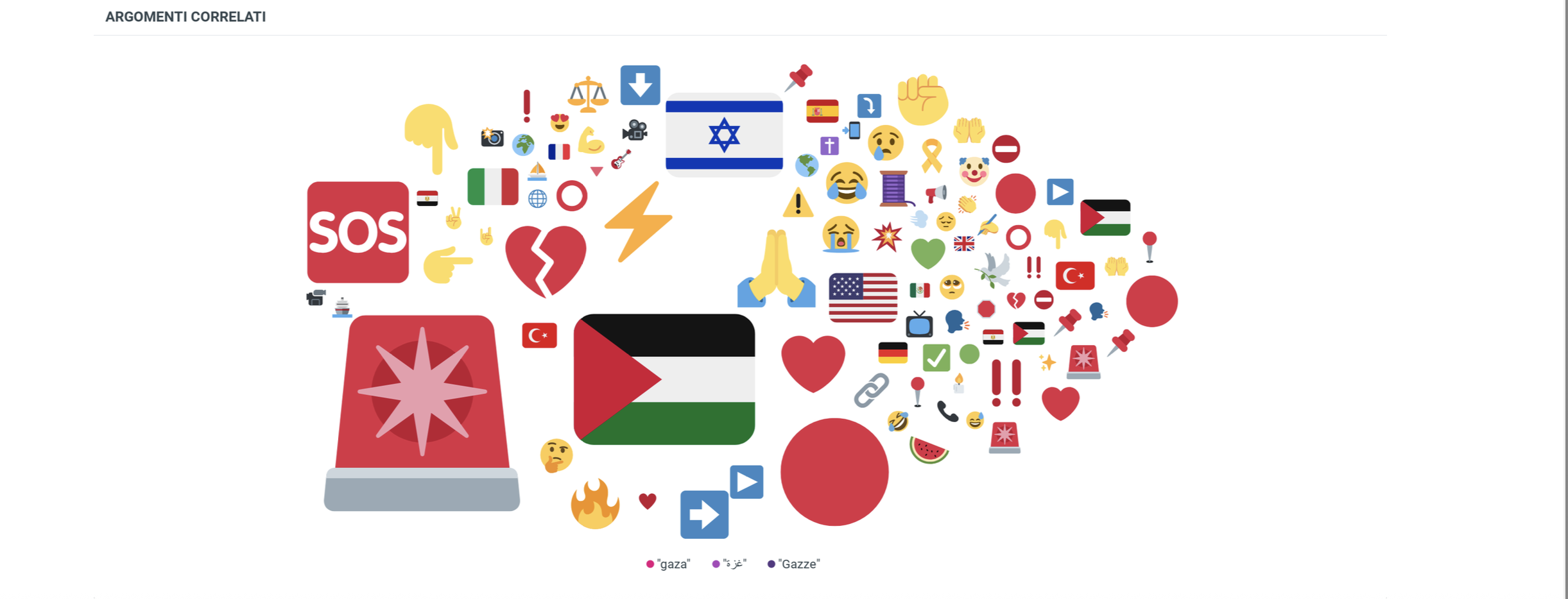 Tra le 100 emoji più utilizzate per commentare la parola chiave Gaza – in tutte le lingue del censimento – troviamo la bandiera della Palestina, quella di Israele, il lampeggiante (che richiama solitamente le breaking news) e le due mani congiunte.