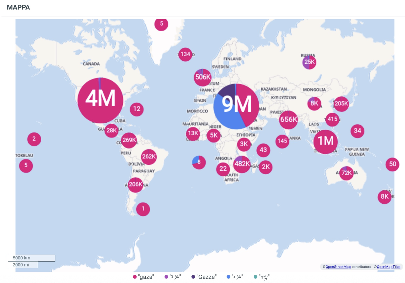 Nelle mappe delle interazioni, è ovviamente l’area del medio-oriente ad aver generato nelle ultime 24 la mole più ampia di reaction: più 9 milioni.
