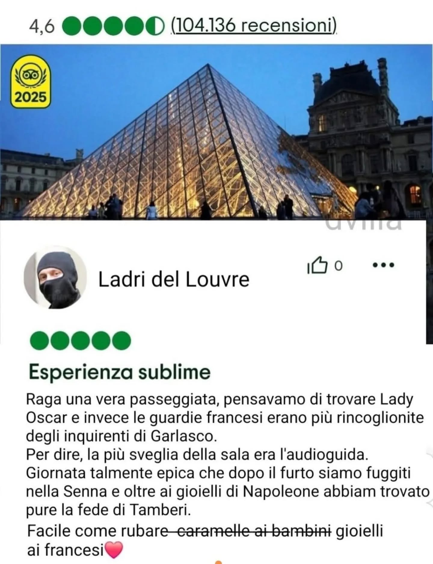 Oggetto di scherno è stato anche il sistema di sicurezza del Louvre, aggirato in pochi minuti. Molti meme hanno infatti preso di mira il personale di vigilanza del museo o le tecnologie di sorveglianza – come la recensione di un ladro su TripAdvisor che parla ironicamente dell’estrema accessibilità dell’attrazione parigina o Checco Zalone in veste di addetto alla sicurezza in Che bella giornata di fronte alla Gioconda.