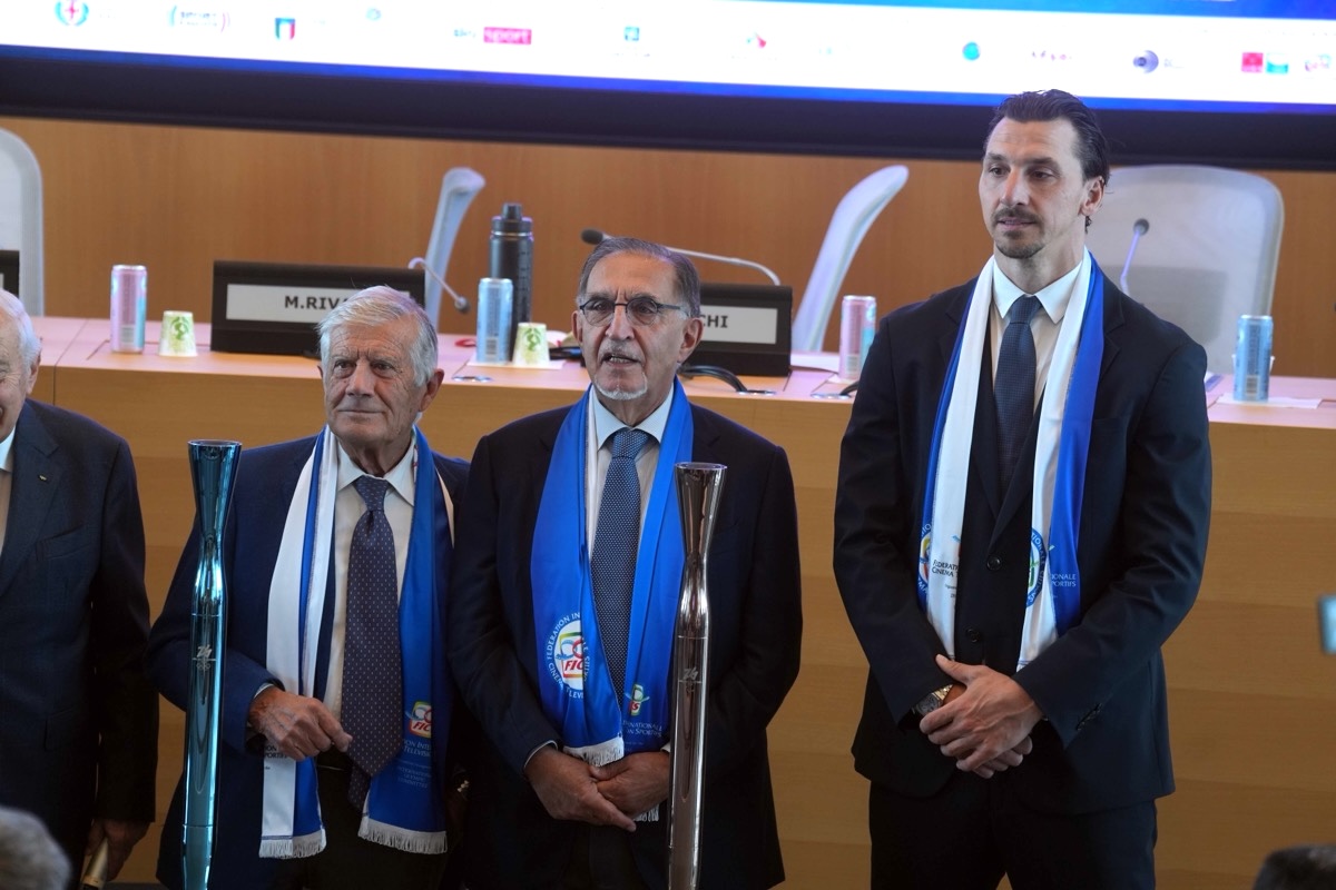 Giacomo Agostini, Ignazio La Russa e Zlatan Ibrahimovic alla presentazione a Milano della “Sport Movies & TV 2025” (03/10/2025, Roma, Imagoeconomica)