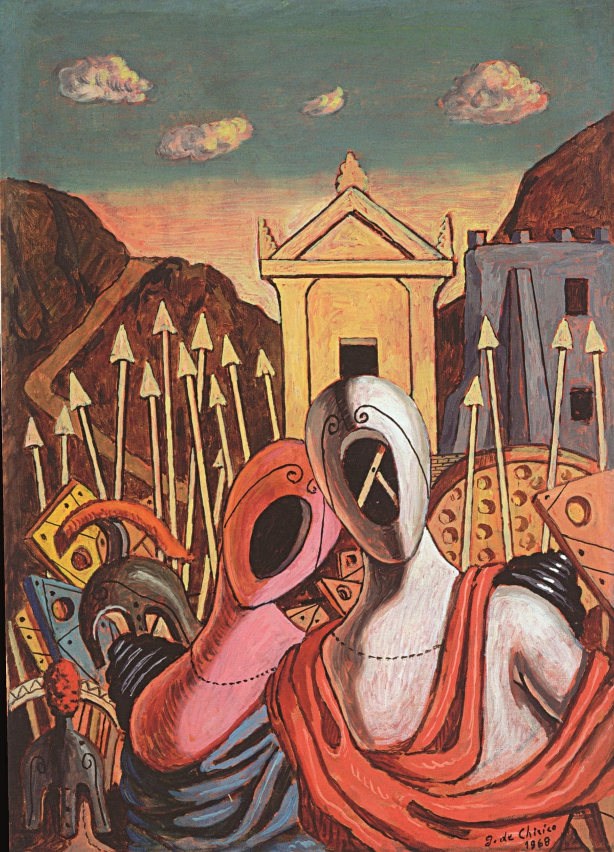 Attorno alla fine degli anni Sessanta del secolo scorso, de Chirico aveva delle visioni di quadri, nel momento del dormiveglia, che riprendevano le prime opere metafisiche ma con nuove declinazioni e invenzioni, racconta ancora Pontiggia. “Per questi quadri non si può parlare quindi di repliche (che peraltro l’artista eseguì per tutta la sua vita) e soprattutto il ‘tono’ è molto diverso: mentre nella prima Metafisica l’artista esprimeva un senso drammatico di assurdità, una consapevolezza che la vita e la materia stessa fossero insensate, negli ultimi anni della sua vita guardò invece a figure e cose con maggior indulgenza”, spiega la curatrice, che riporta un esempio chiarificatore: “Nell’Ettore e Andromaca del 1917 il pittore adombra il destino tragico dei soldati che andavano a morire sul fronte della Prima guerra mondiale; lo stesso soggetto dipinto nel 1968 ritrae i due protagonisti davanti all’esercito schierato alle mura di Troia e, anche se sappiamo che la vicenda finirà drammaticamente, nulla in quest’opera racconta del congedo doloroso tra i due”. Inoltre, i colori delle tele realizzate tra 1968 e 1978 diventano squillanti, luminosi, tanto da essere avvicinati a quelli della Pop Art; in realtà, continua Pontiggia, “de Chirico non aveva bisogno di guardare alla Pop Art, semmai era il contrario; un senso cromatico più felice era tuttavia nell’aria”. Anche i giocattoli che a volte fanno capolino nelle tele del pittore assumono un differente significato e si arricchiscono di un senso ludico e scherzoso. Si individuano inoltre alcuni motivi inediti, in particolare la voluta, che talvolta sembra mettere “tra parentesi” l’immagine, e le figure zigrinate (“come una specie di groppa di dinosauro”, le definisce la curatrice): emblematico in tal senso è Battaglia sul ponte del 1969.