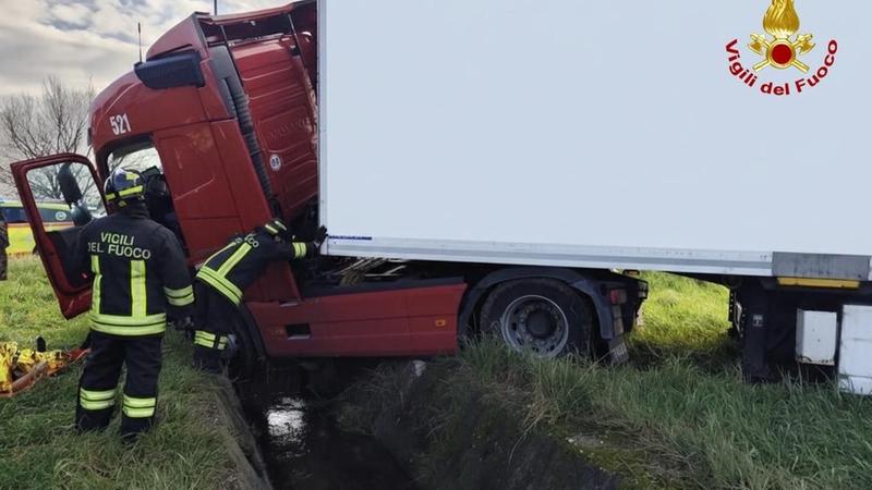 Tir si ribalda nel canale a bordo strada: ferito l'autista. Traffico sulla Porcilana