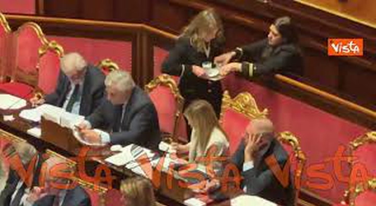 Un bicchiere d'acqua per la premier Meloni durante la discussione in Senato sulla crisi in Iran